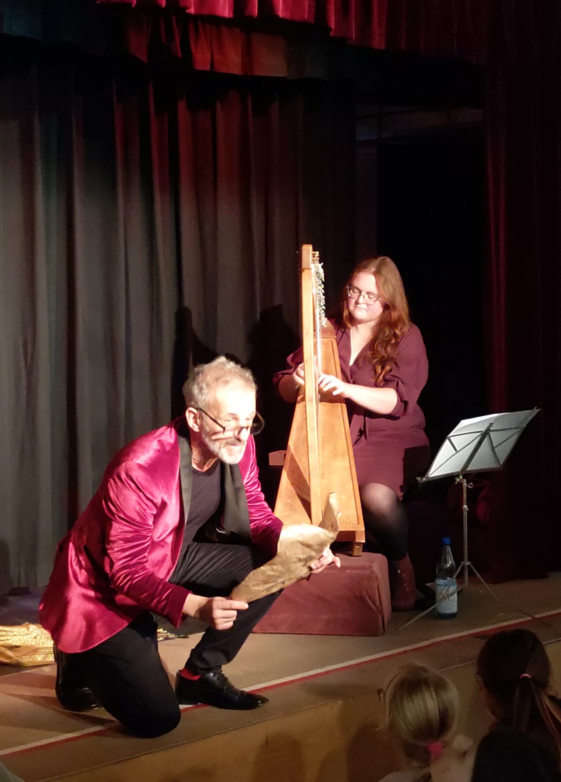 Ein Duo, das bei Kultur im Dunkeln zu einander fand. Eine wundervolle Kombination aus Märchen oder Erzählung und Harfe. Beide Könner Ihres Fachs. Sie beweisen dass Märchen nicht nur was für Kinder sind! Gemeinsam entführen die Künstler uns in den Orient. Wundervoll erzählt, ideal ergänzt durch zartes oder kräfitges Saitenspiel, immer passend zur Stimmung. Ein besonderes Erlebnis